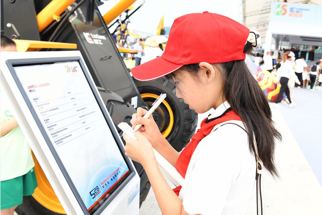 烈日炎炎,擋不住萌娃們探索的腳步,他們走進活動現場產品靜態展示區,高端化、智能化、綠色化的柳工全系列工程機械產品引發了孩子們一連串的問題。